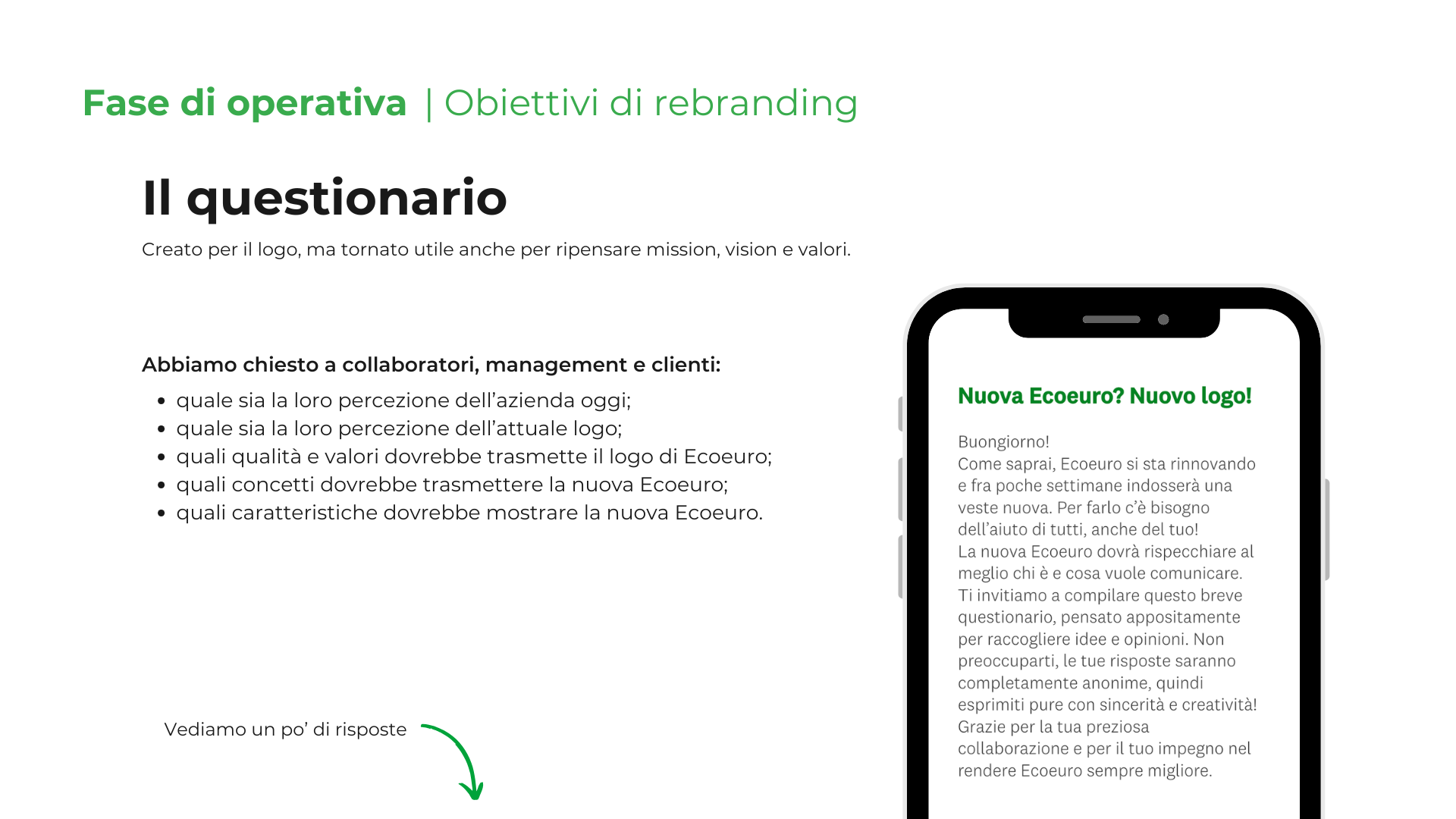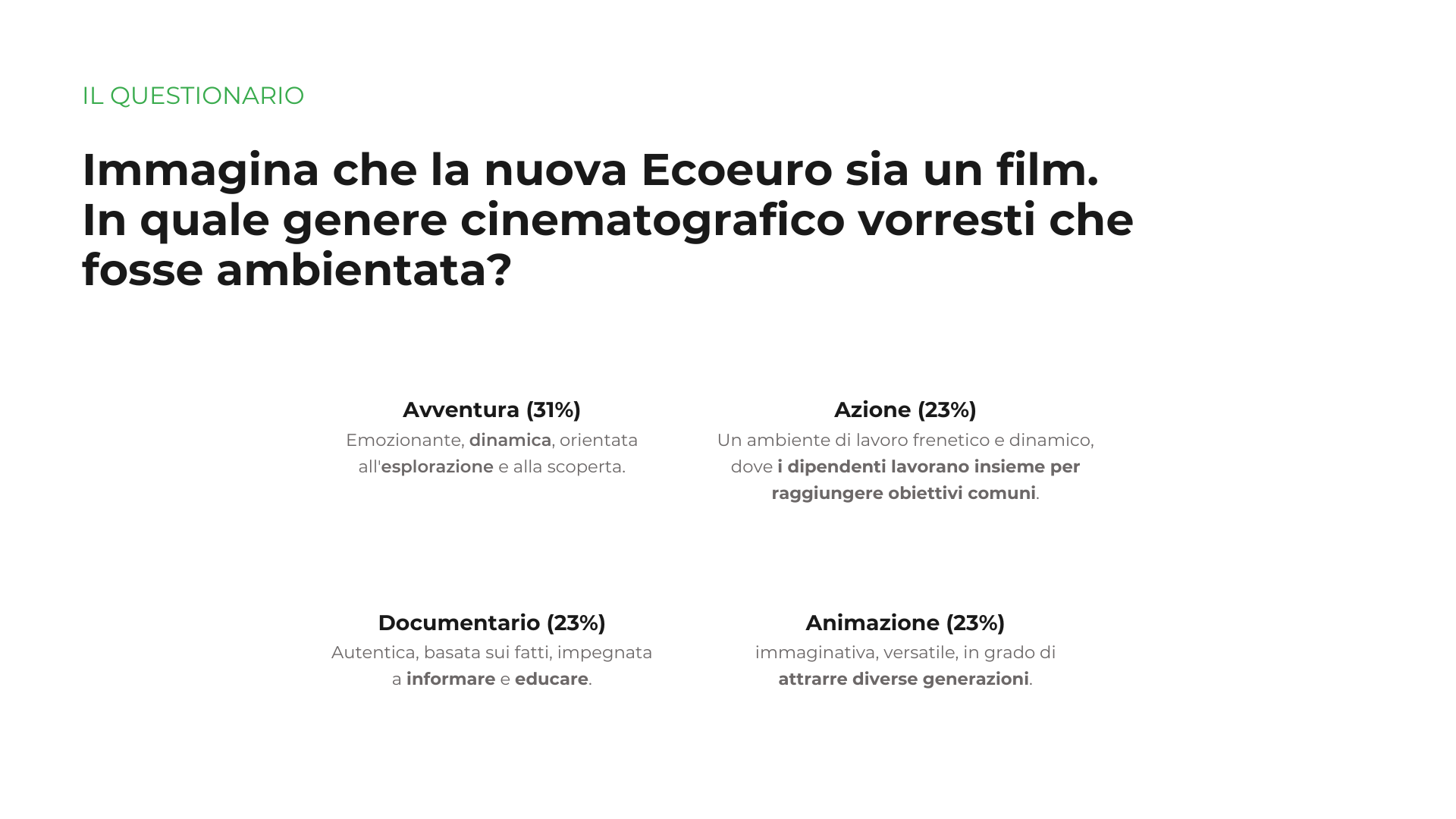 L’obiettivo era raccogliere la percezione dell’azienda e comprendere come dipendenti, management e clienti storici immaginassero la sua evoluzione futura. Conoscere la vera essenza di Ecoeuro tramite chi la vive da vicino e quale immagine secondo loro dovesse assumere in futuro ha permesso di individuare i valori cardine su cui fondare la nuova strategia di comunicazione